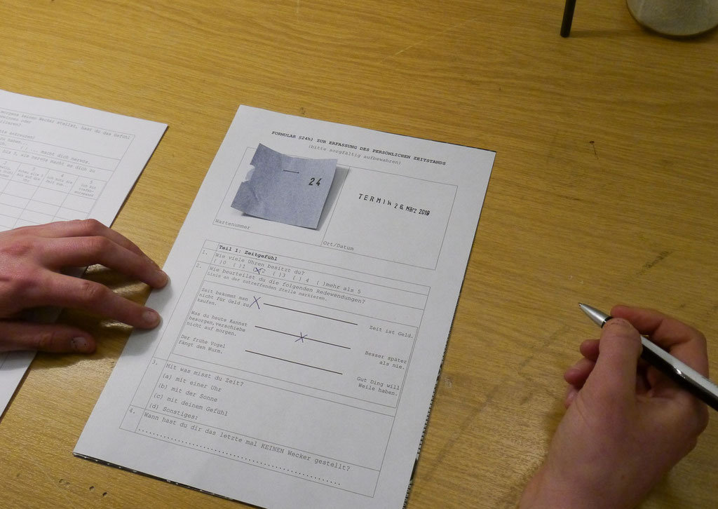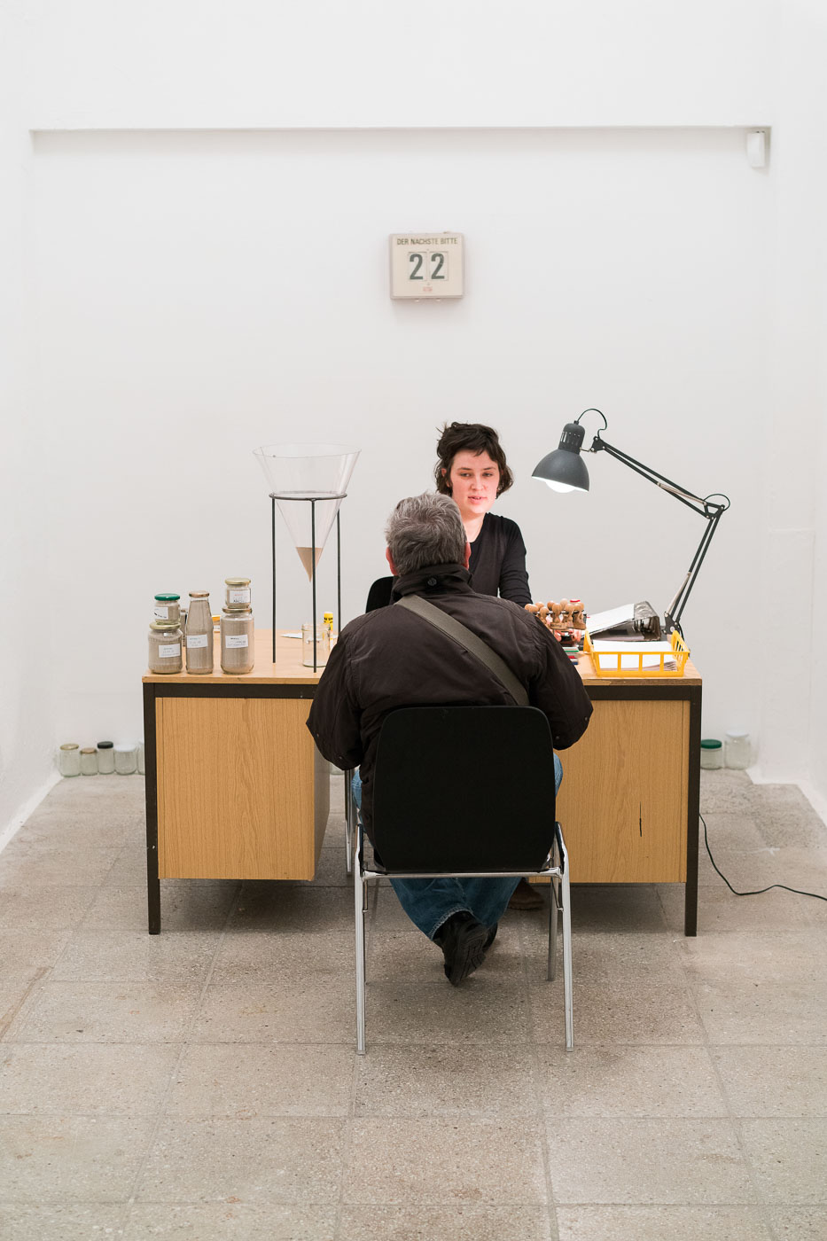 Für die Ausstellung “täglich geöffnet” im Volkspark Halle (Saale) habe ich mir explizit eine Woche Zeit genommen, um sie in den Ausstellungsräumen zu verbringen. Diese genau bemessene Zeit habe ich an andere weitergegeben. Dafür befragte ich die Besucher*innen in meinem Büro zu ihrem Zeitbedürfnis und dem Umgang mit ihrer Zeit. Ich verwaltete meine eigene und versuchte Antworten auf meine Fragen zu finden. Wer das Büro betrat, zog eine Wartenummer und ging mit einem Glas voll Zeit.