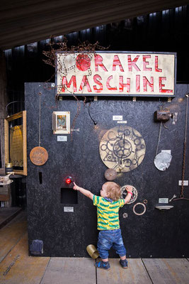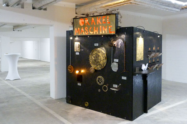 die orakelmaschine will mit drängenden, persönlichen unwichtigen und entscheidenden fragen gefüttert werden. dabei kann entschieden werden, auf welche reise die frage geschickt werden soll: über den tellerrand oder auf umwege? passt sie ins out of space oder ist sie eher quadratisch-faktisch ? die maschine arbeitet und rattert, verdaut die fragen und spuckt antworten aus. sie produziert gleichermaßen erkenntnis wie verwirrung.