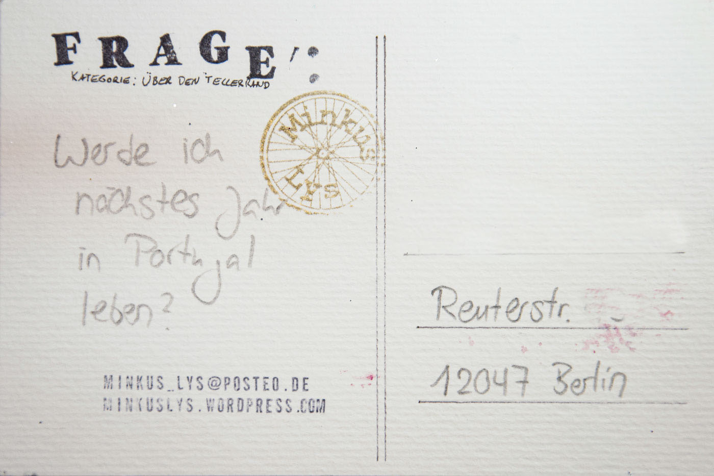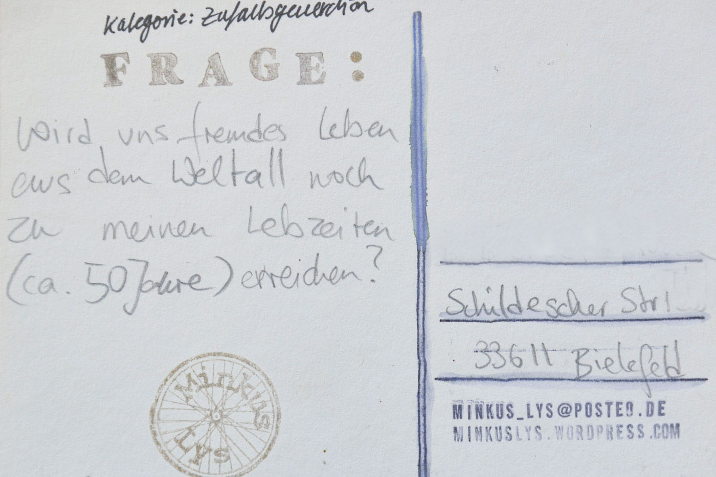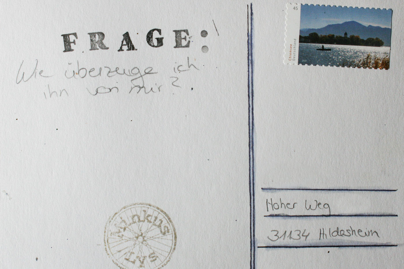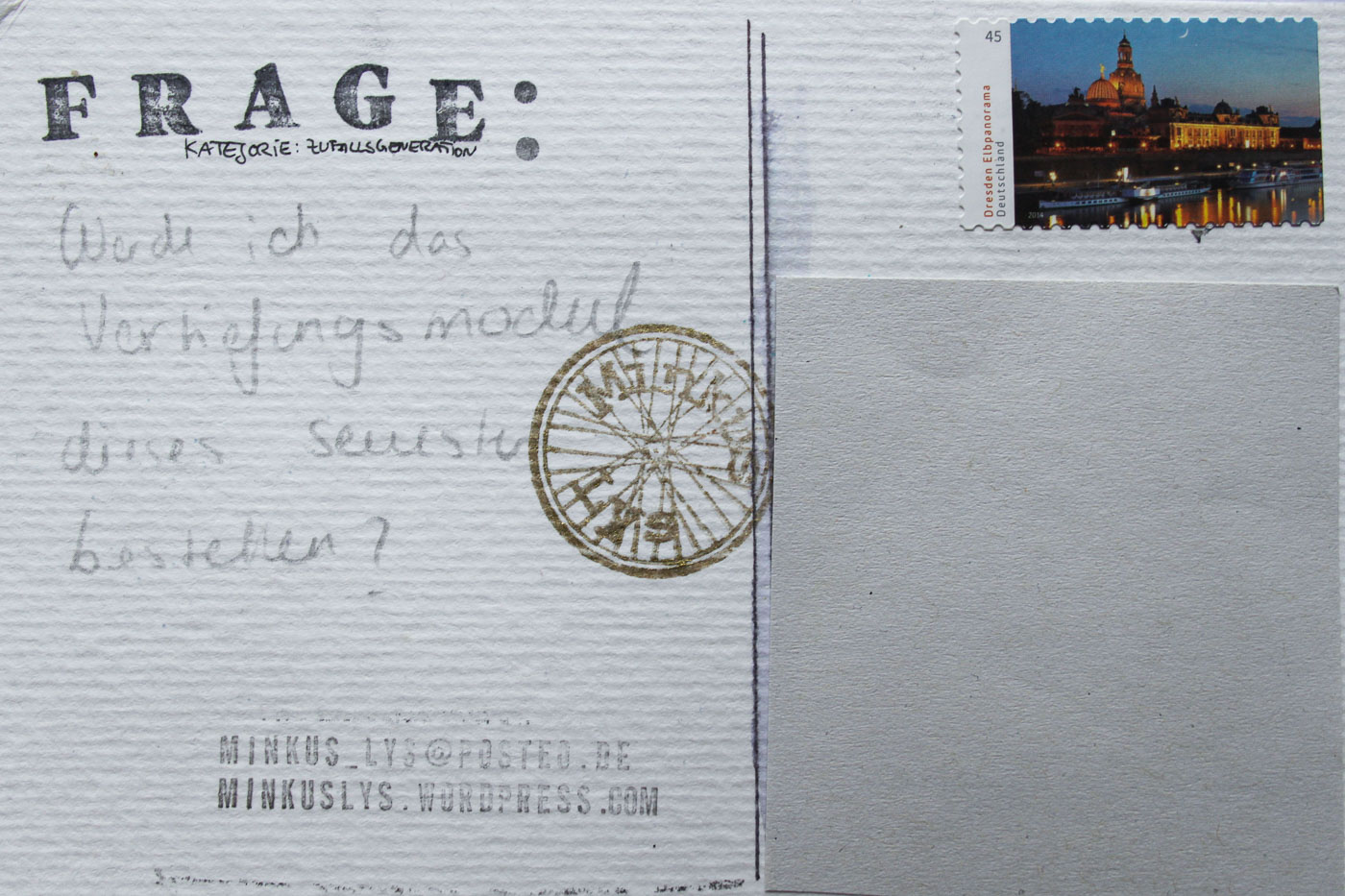 Auf verschiedenen Wegen kann die Orakelmaschine um Antworten auf persönliche Fragen gebeten werden: eine mit einer Frage beschriftete Postkarte wird in das entsprechende Fach geworfen und nach etwas Zeit kommt eine collagierte und individuell angefertigte Antwort aus der Maschine heraus.